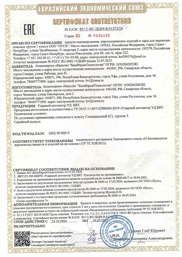 Евразийский экономический союз (Сертификат соответствия) Ударный Детонатор УД БВТ