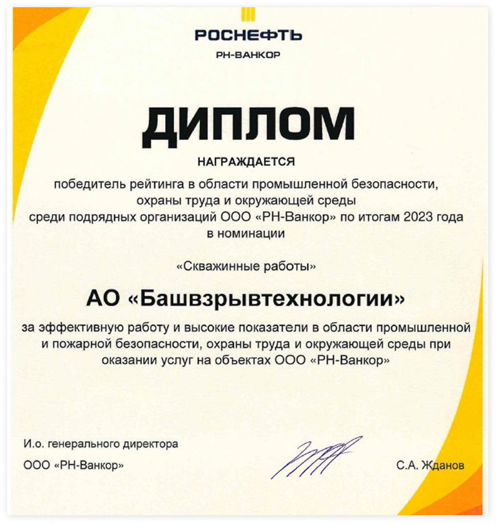 АО «БВТ» было объявлено победителем рейтинга в области промышленной безопасности, охраны труда и окружающей среды среди подрядных организаций ООО «РН-Ванкор» в номинации «Скважинные работы».