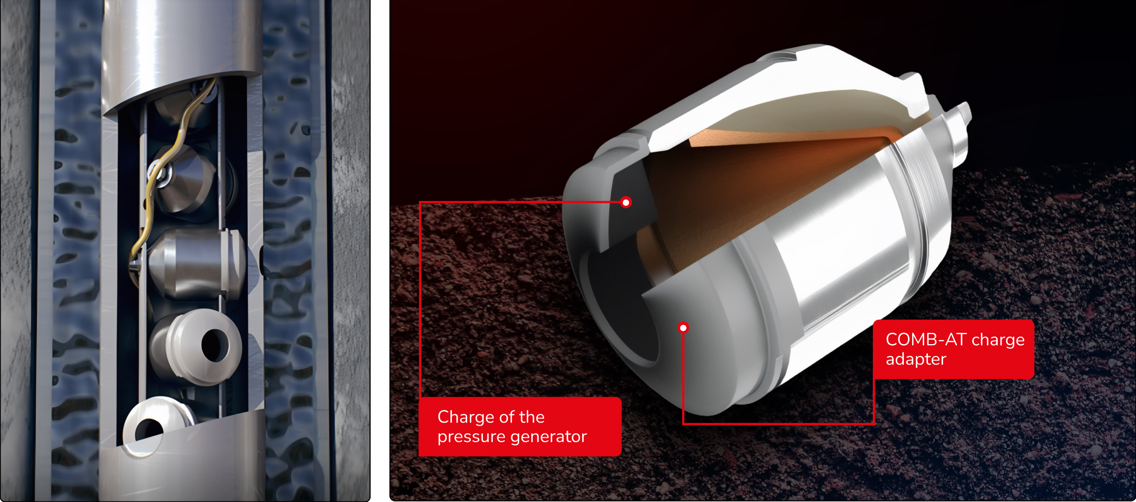 To initiate and propagate fractures in the surrounding reservoir rock, COMB-AT uses a specialized energetic solid propellant material that ignites after the detonation of the shaped charge, generating a high-energy pressure pulse. The result of this process is perforation channels with enhanced effectiveness.