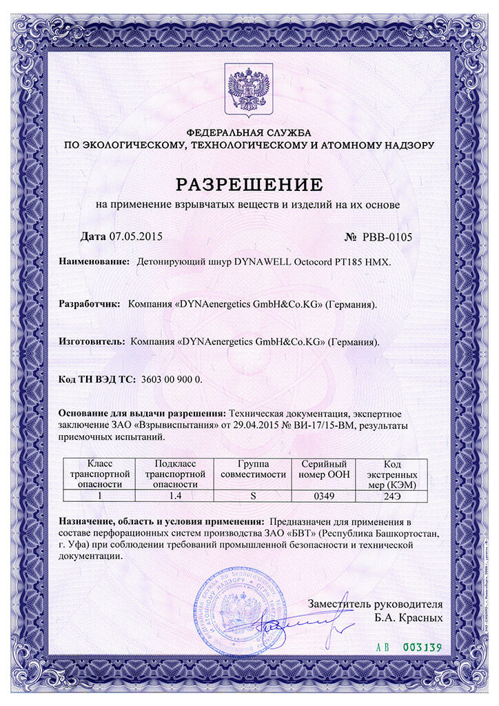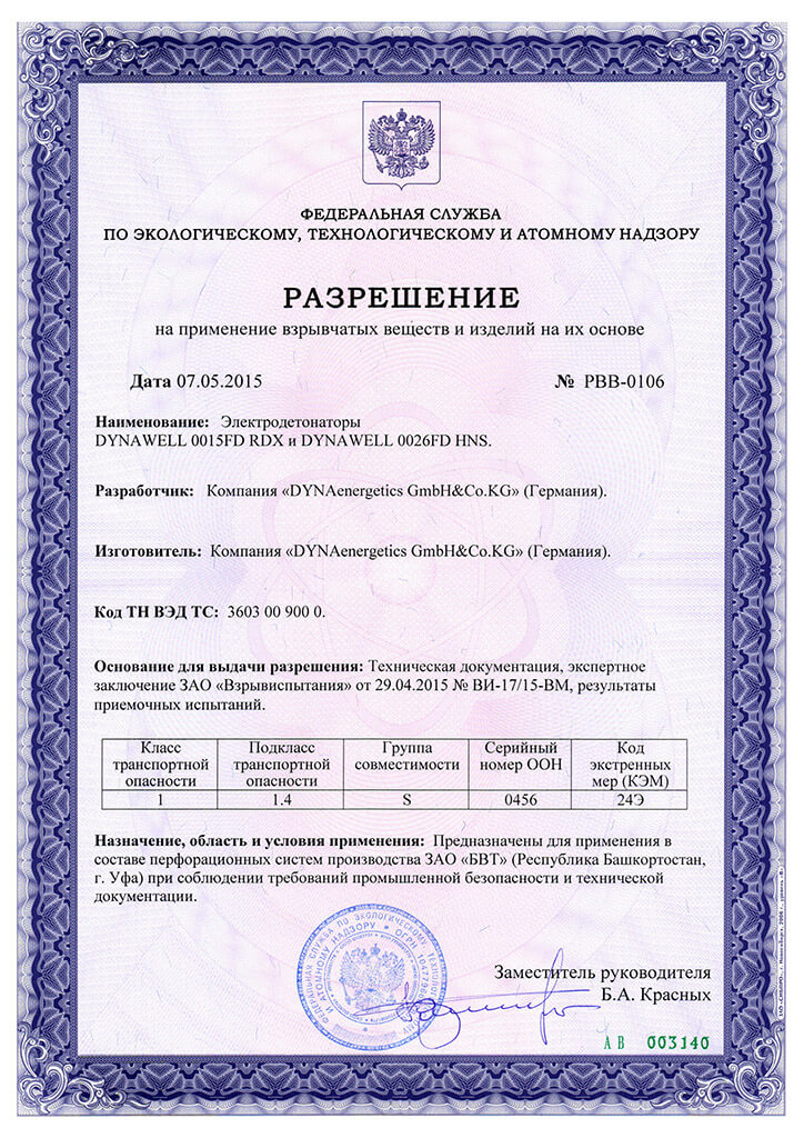 Разрешение на ПВВиИНИО (Электродетонаторы DYNAWELL 0015FD RDX и DYNAWELL 0026FD HNS) 2015