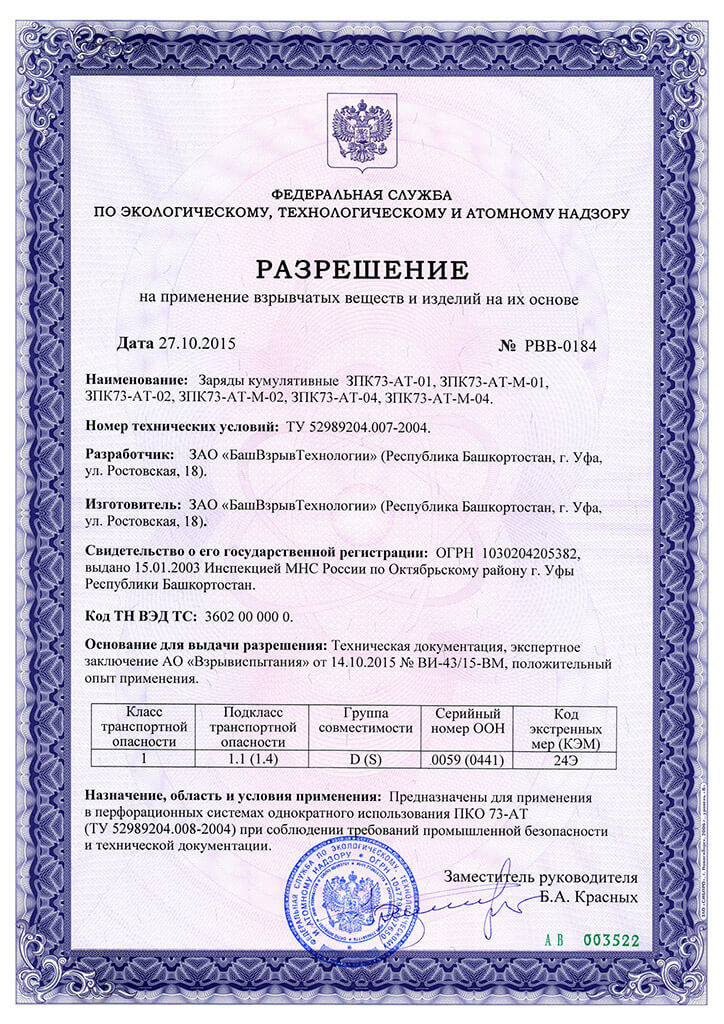 Разрешение на ПВВиИНИО (ЗК ЗПК 73-АТ)